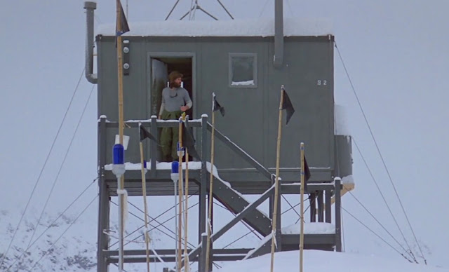 The hero of the story is seen here standing amongst black flags at the Antarctic base. A threatening environment with a threatening life force, from beyond. Or maybe an ancient life form? This movies is a hybrid classic that lightly traces the original seed to The Thing From Another World 1951 and Who Goes There? 1938 novella by Don A. Stuart.